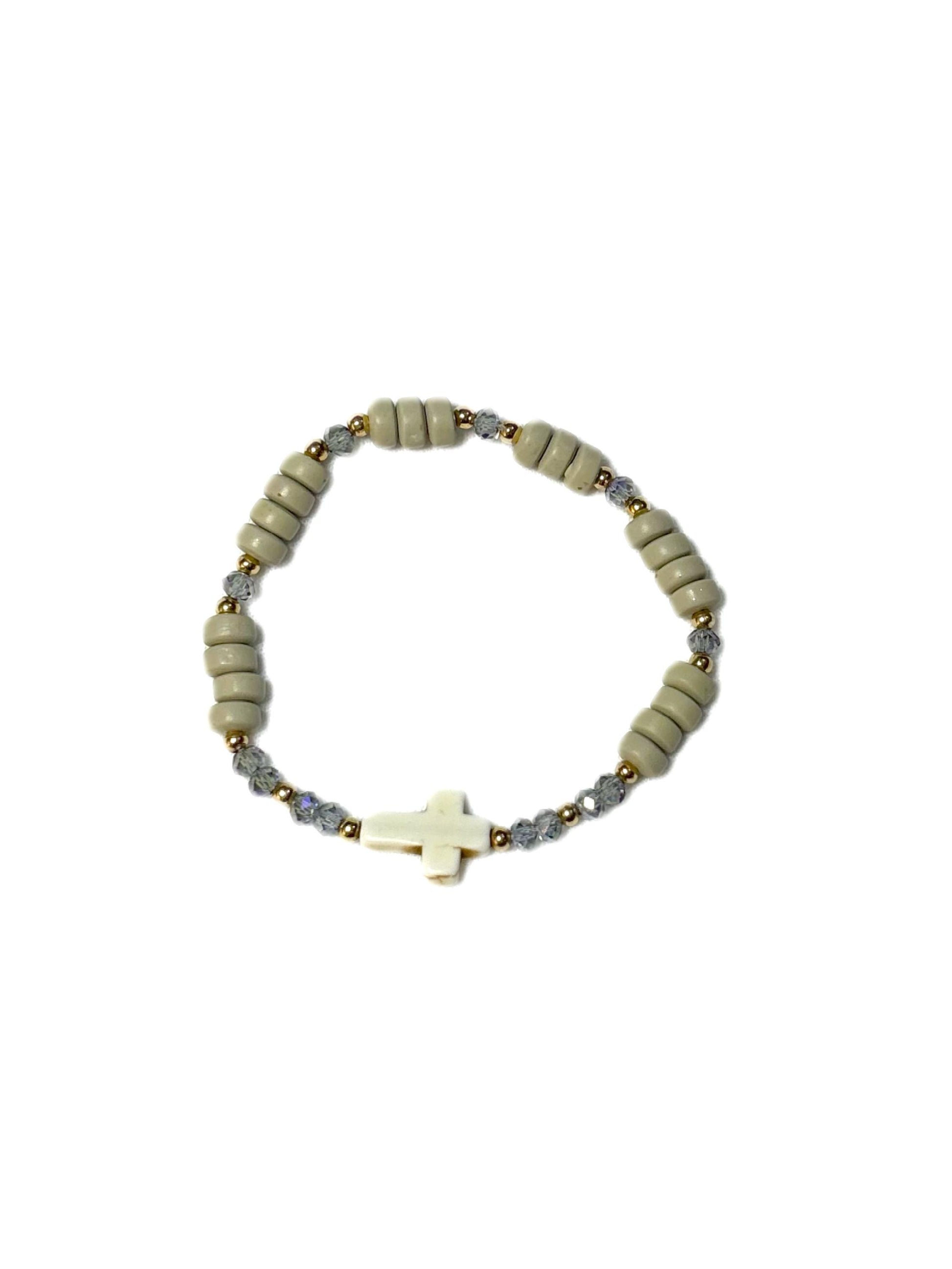 A calming blend of neutral clay beads, a hint of sparkle, and a howlite cross centerpiece — made for quiet strength and inner peace. Howlite is known for its soothing energy, believed to ease anxious thoughts, encourage patience, and open the door to spiritual clarity.