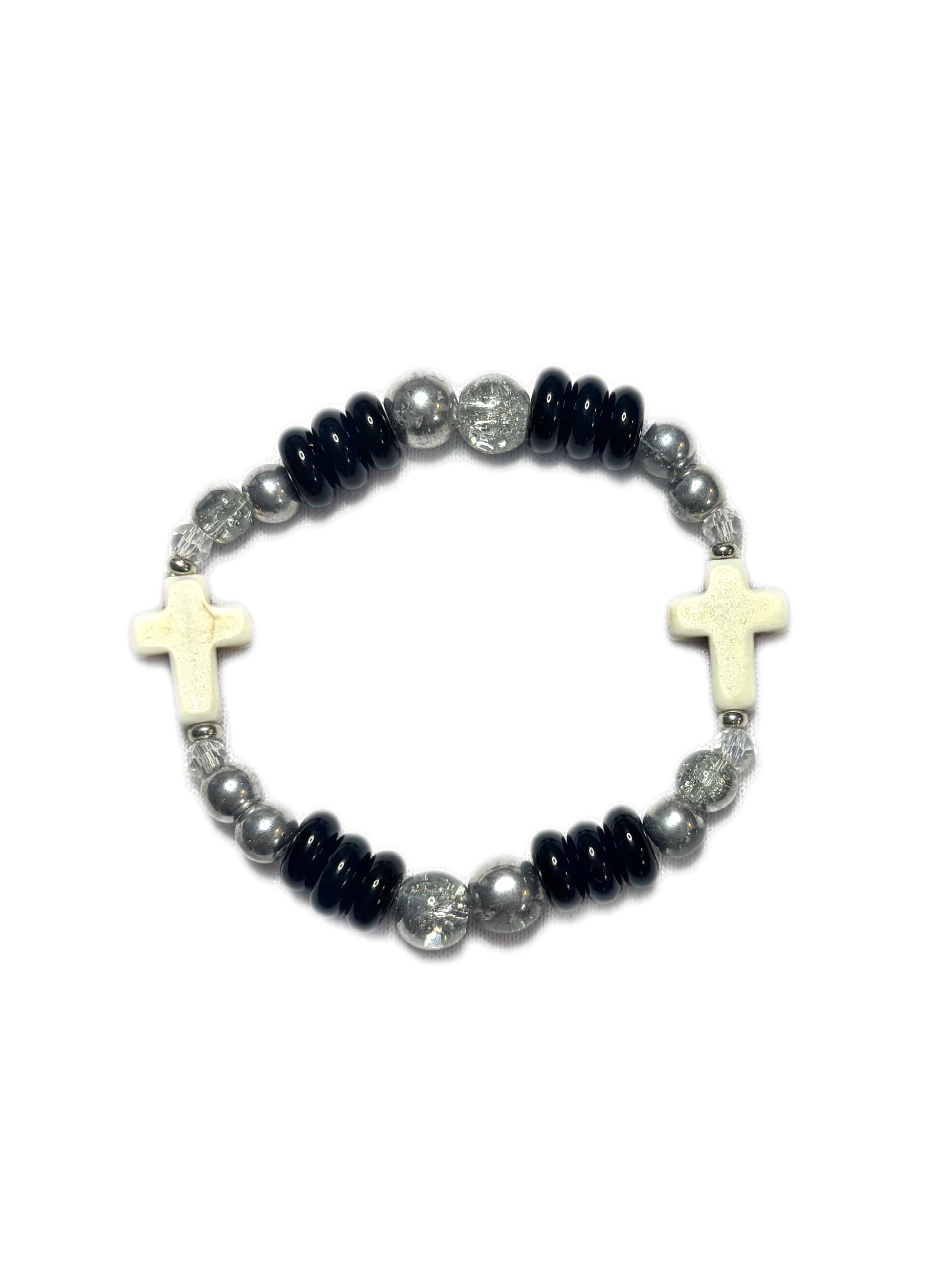 Cross Bracelets — one featuring a smooth white howlite cross for a calm, grounded vibe, and the other designed with silver cross accents for a little edge and shine. Both are made with a mix of black glass beads and sparkly silver beads, giving that perfect balance of bold and classic.